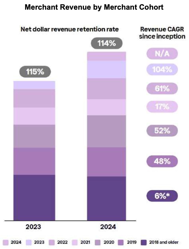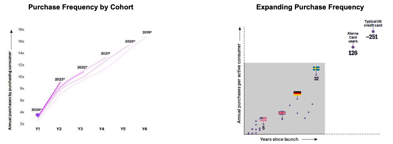 The company's revenue model has proven remarkably resilient, with strong merchant revenue retention. Klarna achieved net dollar revenue retention rates of 115% in 2023 and 114% in 2024, demonstrating their ability to expand revenue from existing merchants. Merchant cohorts from as far back as 2018 continue to grow revenue at impressive rates, with the 2023 cohort achieving a 104% CAGR since inception. This retention and expansion success illustrates how Klarna creates lasting value for merchants, rather than merely serving as a transactional payment option.