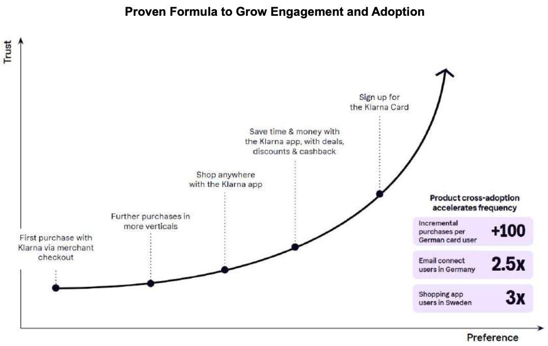 Klarna's proven formula for growing engagement and adoption follows a clear progression curve: from first purchase via merchant checkout, to additional purchases across verticals, to shopping anywhere with the Klarna app, to using Klarna for deals and cashback, and finally to signing up for the Klarna card. This increasing engagement drives trust and preference, with each new product adoption accelerating purchase frequency. For example, German card users made 100 more purchases per year compared to non-card users, and email connect users transacted 2.5 times as frequently as non-email connect users.
