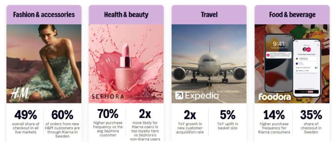 The merchant success stories highlighted in the F-1 provide evidence of this network effect in action. With H&M, Klarna's share of checkout has reached nearly 50% across all markets, and in Sweden, 60% of orders from new customers are made through Klarna. Sephora has seen Klarna users shop 6.8 times per year on average, compared to 4 times for all Sephora consumers. Foodora experienced a 14% increase in Klarna consumer purchase frequency after using Klarna's advertising solutions. These examples demonstrate how Klarna creates value throughout the commerce ecosystem.