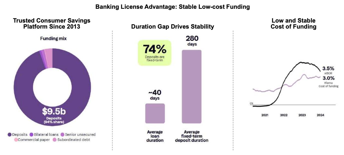 This regulatory status enables Klarna to fund 94% of its financing products through deposits ($9.5 billion as of December 2024), providing a lower-cost and more stable funding base than non-bank competitors. This creates a virtuous cycle where deposits fund loans, which generate revenue, which attracts more deposits.