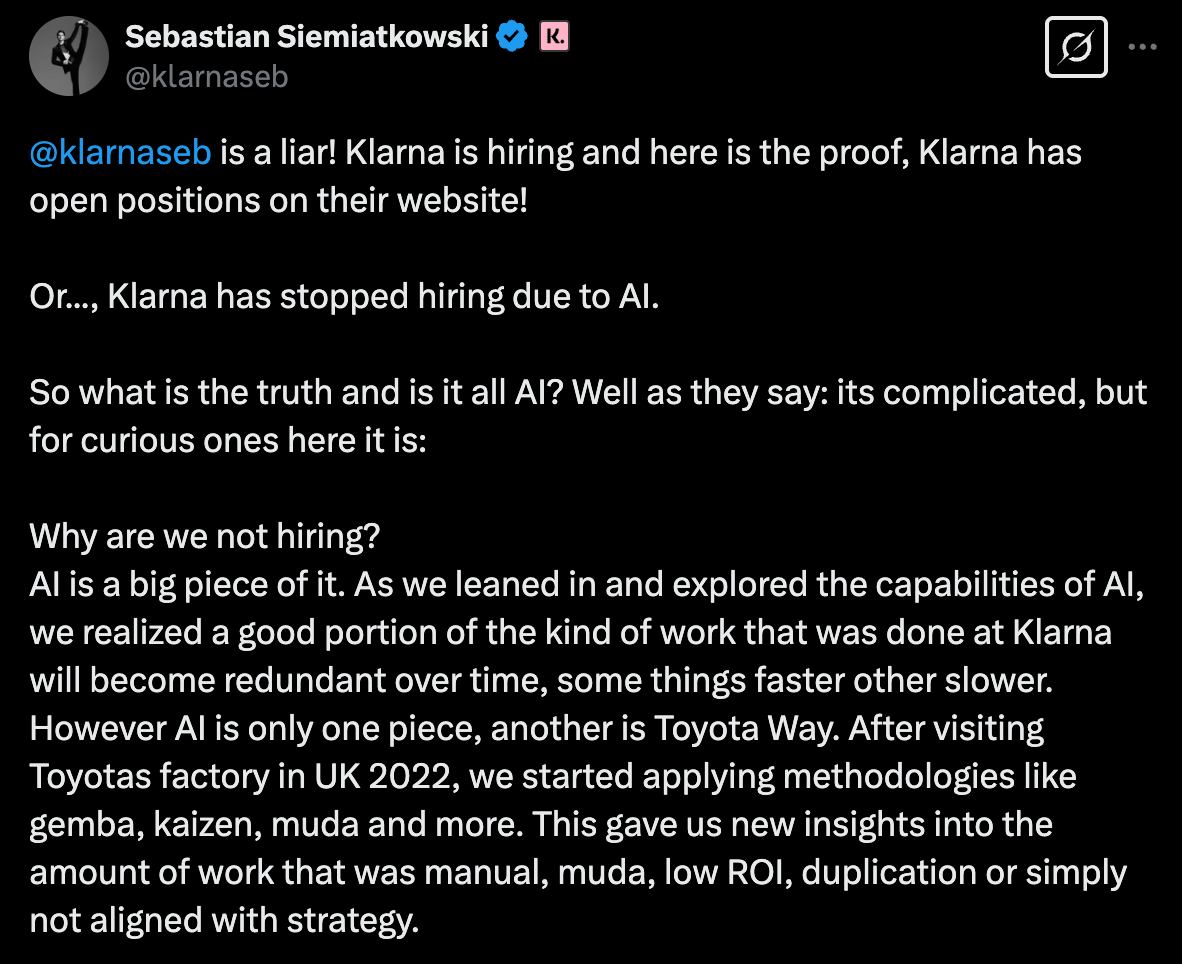 "AI is a big piece of it. As we leaned in and explored the capabilities of AI, we realized a good portion of the kind of work that was done at Klarna will become redundant over time."
