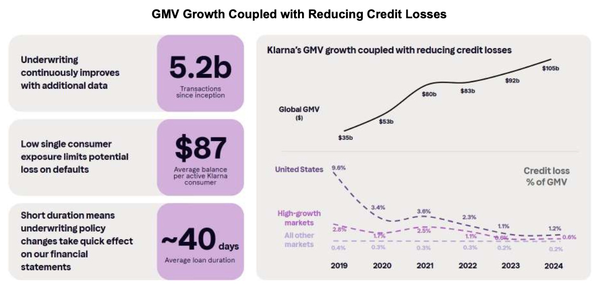 The company's proprietary data and sophisticated credit underwriting represent another significant advantage. Unlike traditional credit card issuers who typically make a single underwriting decision at account opening, Klarna makes real-time decisions for every transaction. Their credit model leverages machine learning and a unique dataset including "more than 2.5 billion SKU-level data points collected in 2024." This approach results in superior risk management, with consumer credit losses well below industry averages.