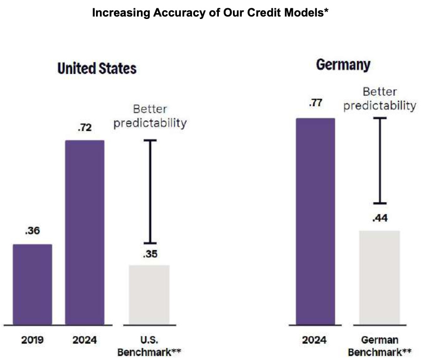 The company's credit underwriting model has improved dramatically in a short period. In the United States, Klarna has increased its Gini score (a measure of predictive accuracy in credit models) from 0.36 in 2019 to 0.72 in 2024 - exceeding the US benchmark score of 0.35. This improvement reflects the power of Klarna's machine learning models and data advantage, which have allowed them to reduce credit losses in the US from 9.6% in 2019 to just 1.1% in 2024.