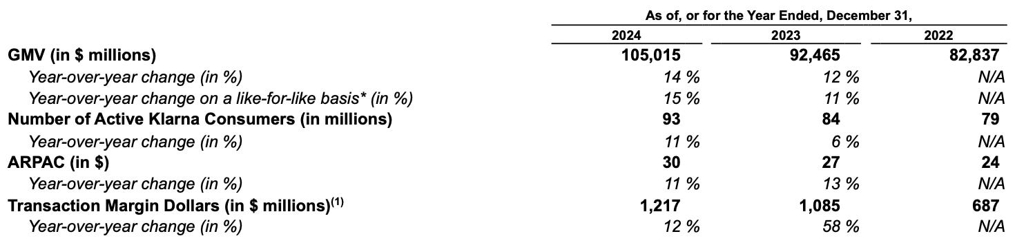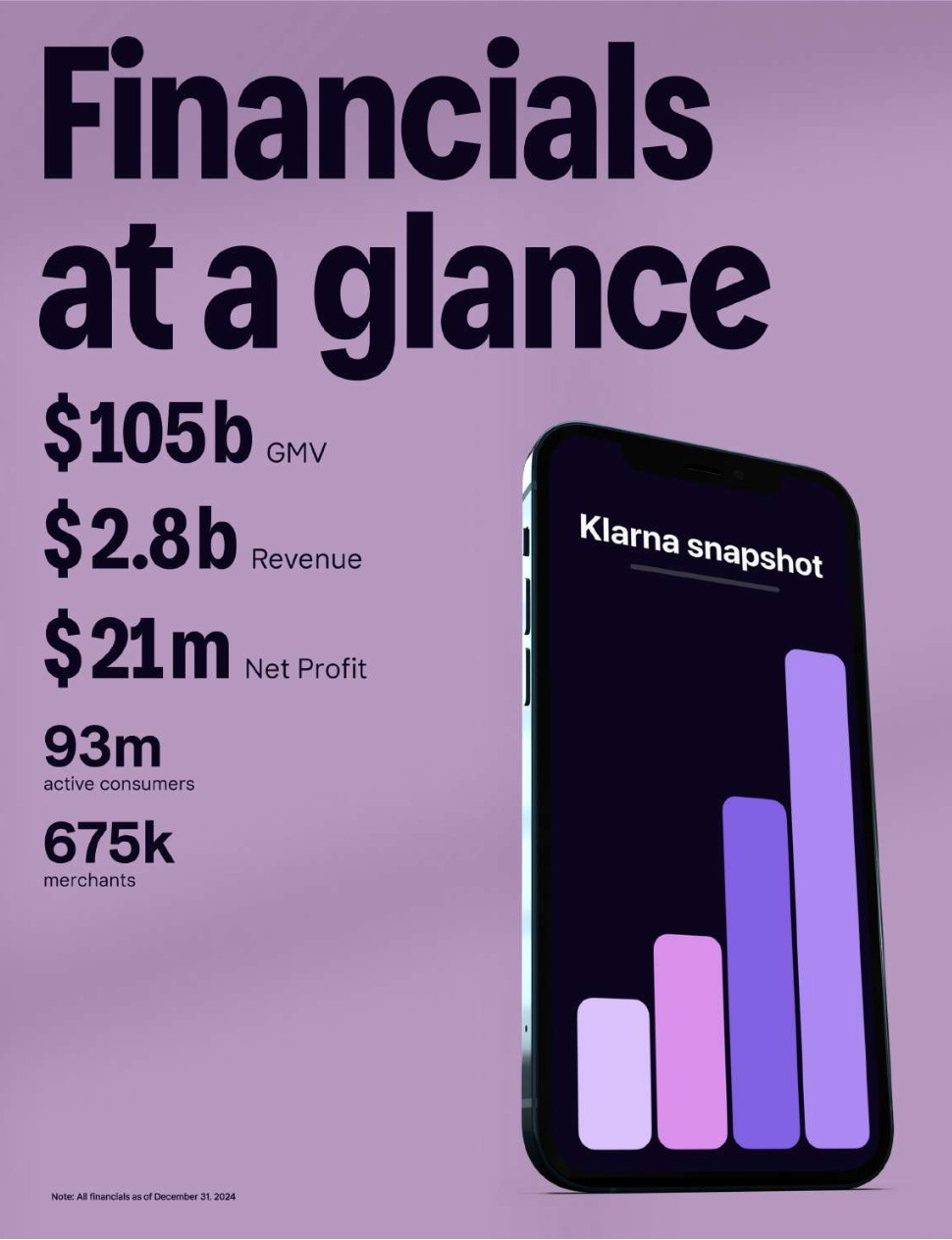 According to their F-1 filing, Klarna has built "one of the largest commerce networks in the world," serving approximately 93 million active consumers and more than 675,000 merchants across 26 countries as of December 2024. The company facilitated an impressive $105 billion in Gross Merchandise Volume (GMV) in 2024 alone. What's particularly notable is how they've achieved this scale while maintaining strong financial performance - in 2024, their total revenue reached $2.8 billion, representing 24% year-over-year growth, while their operating loss improved by 63% to $121 million.