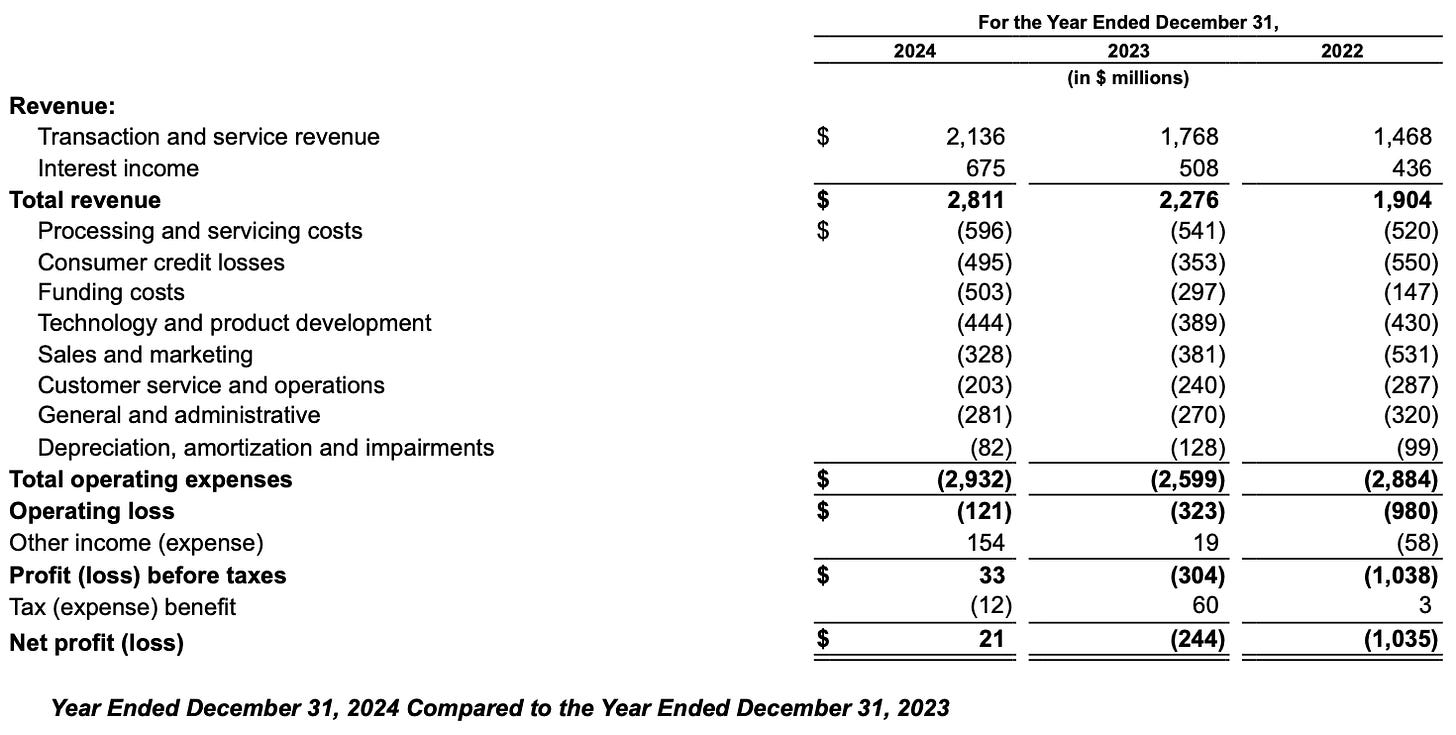 These financial results position Klarna favorably for its upcoming IPO, with the company achieving profitability in 2024 ($21 million net profit) after several years of strategic investment in growth. The path to profitability has been powered by Transaction margin expansion, disciplined operating expense management, and increasing operational leverage. From 2022 to 2024, Klarna's operating loss improved by an impressive $859 million, transforming from a $980 million loss to a much smaller $121 million loss - a testament to the scalability of their business model.